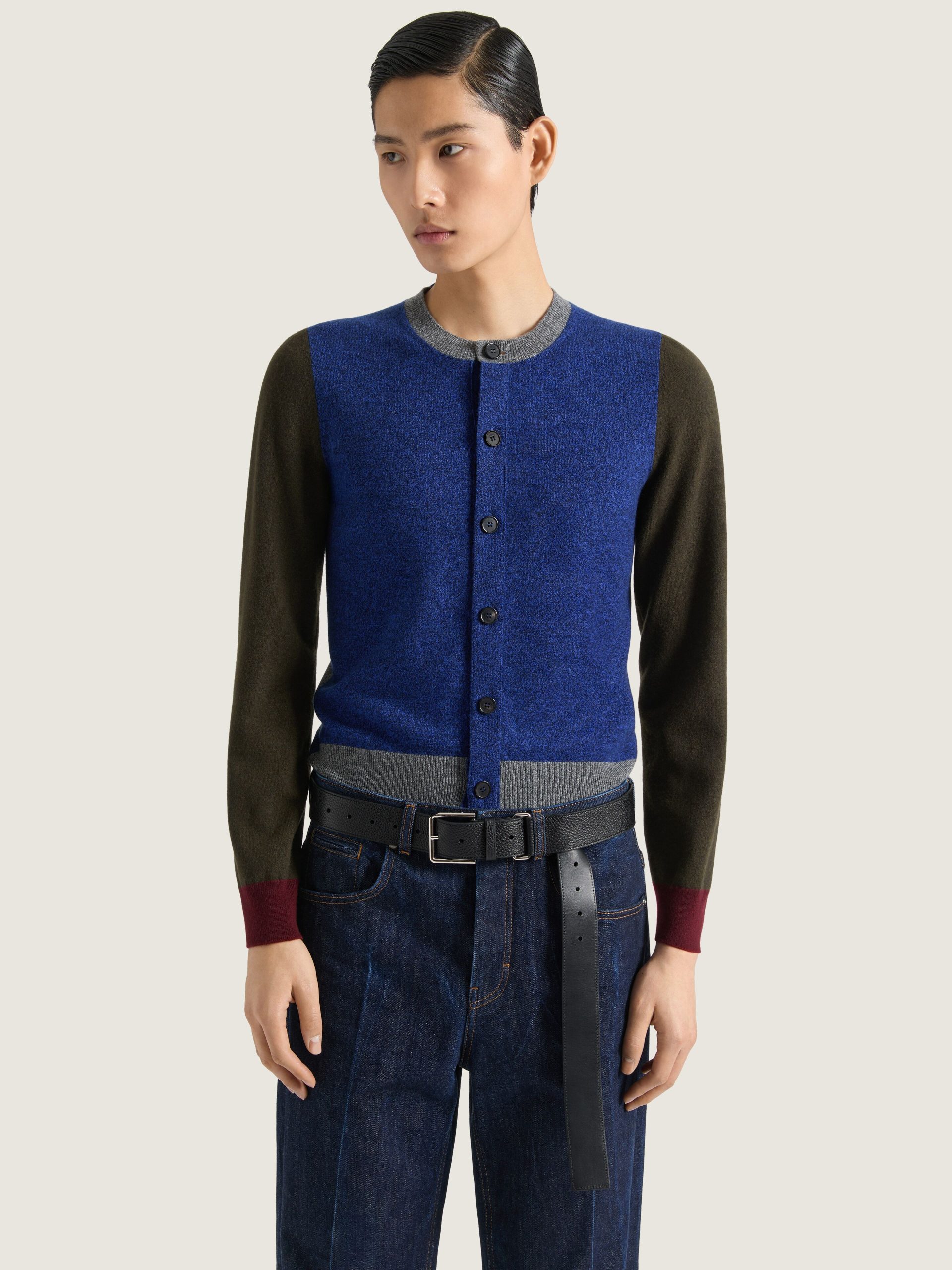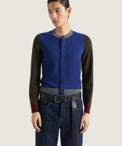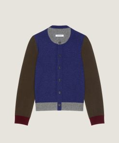 - Long-sleeved color block cardigan in heathered wool.