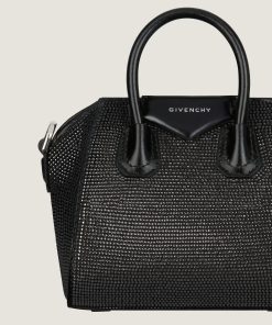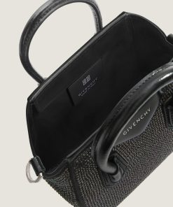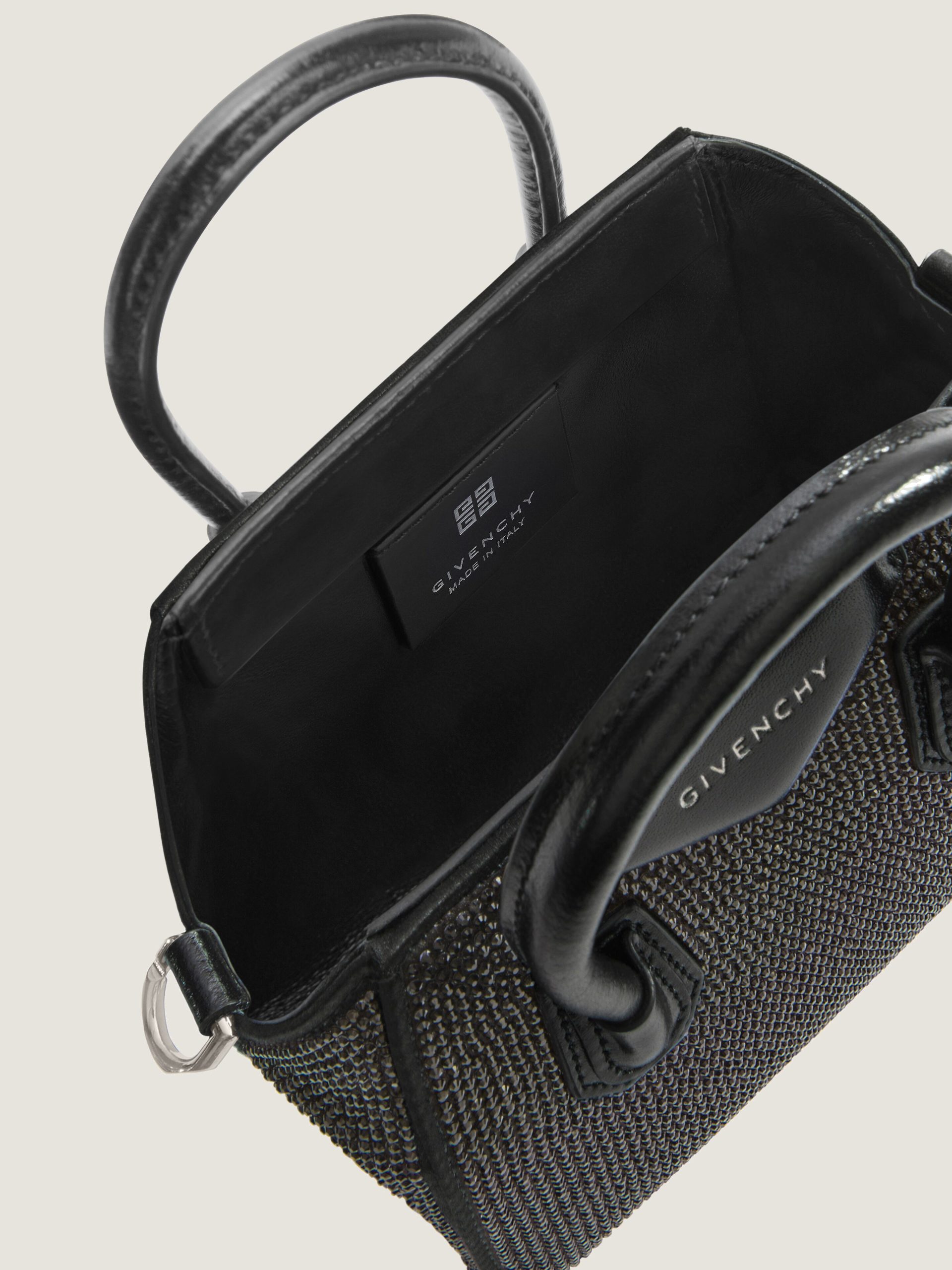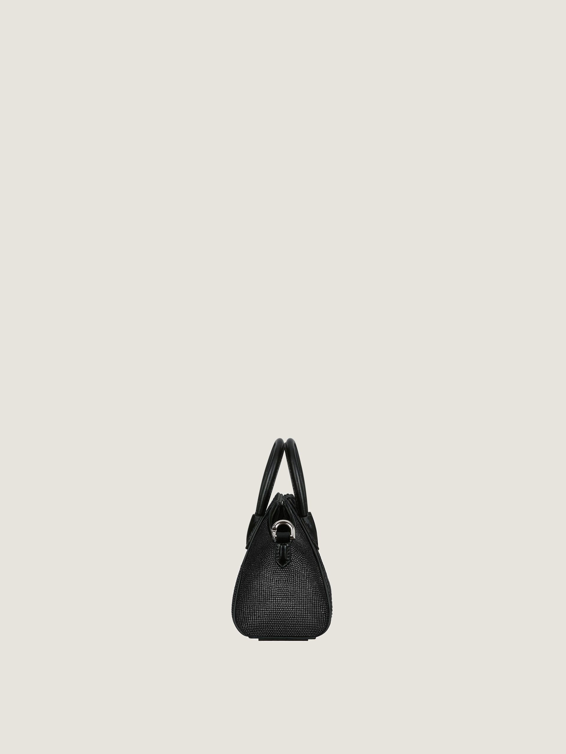 - Micro handbag or crossbody bag in satin covered with all-over strass.