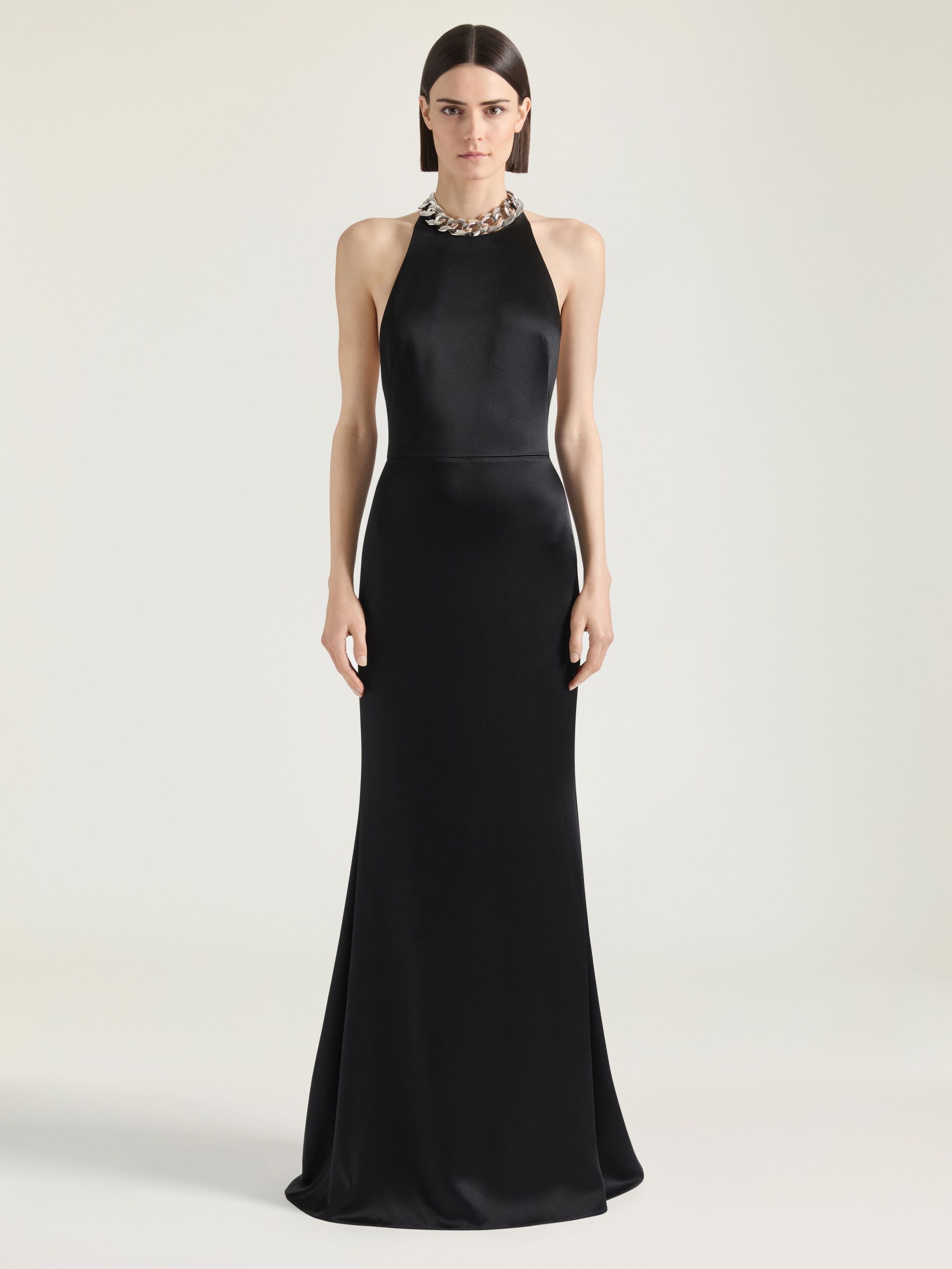 - Long dress in crepe with satin back.