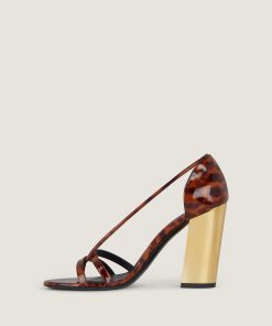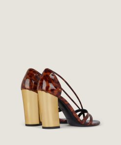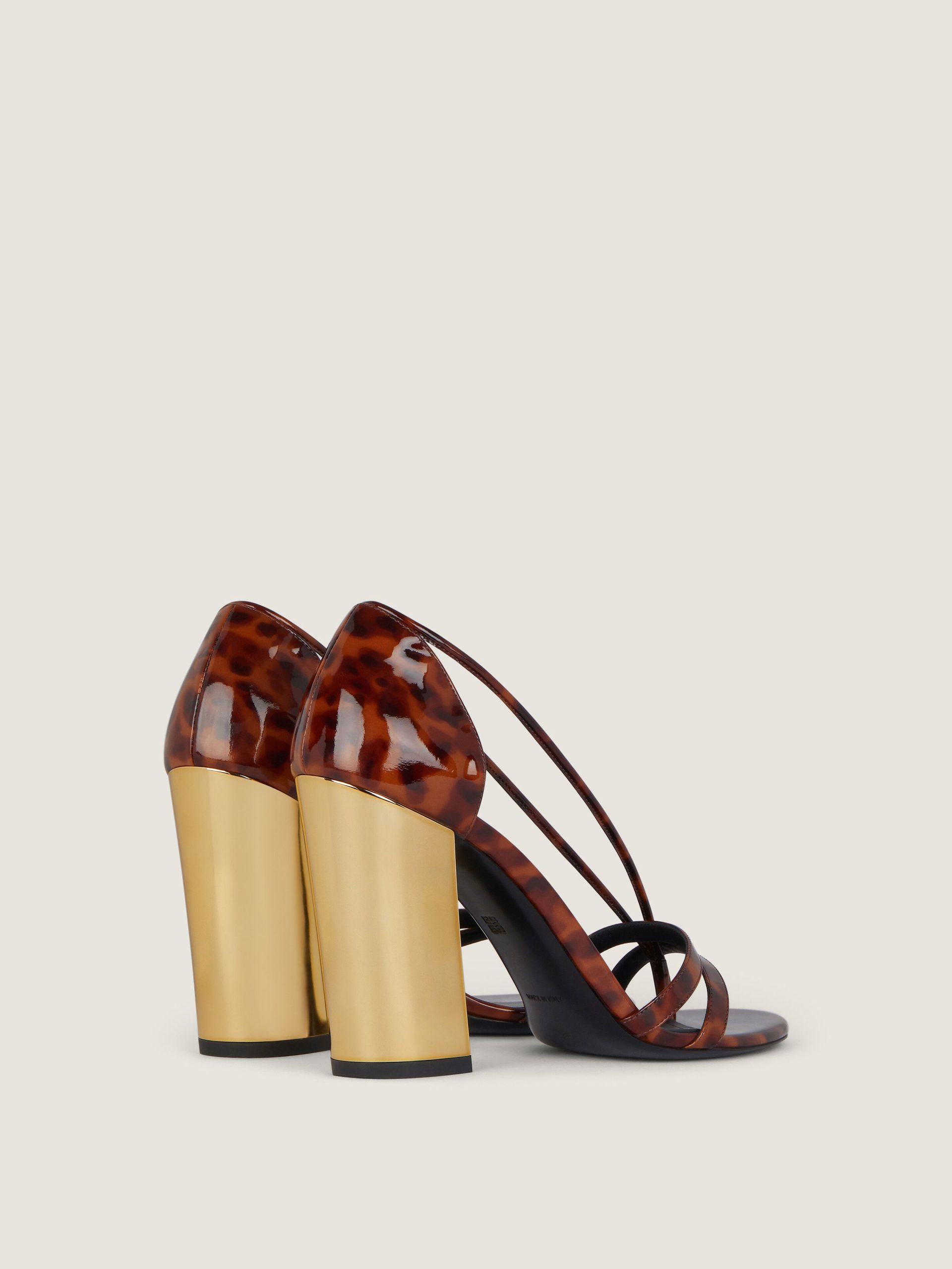 - Heeled sandals in tortoise shell effect patent calfskin leather.